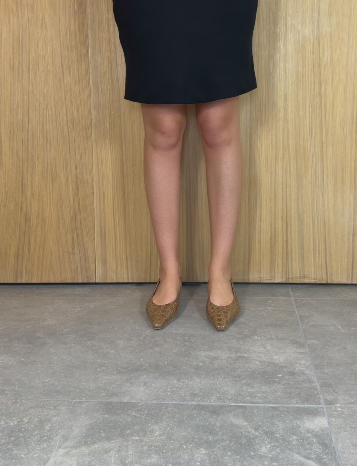 This elegant slingback in brown crocodile-embossed leather combines timeless minimalism with feminine ease. The silhouette is simple and refined with a square toe that gives a sophisticated look, while the open heel adds a light and modern edge to the shoe.